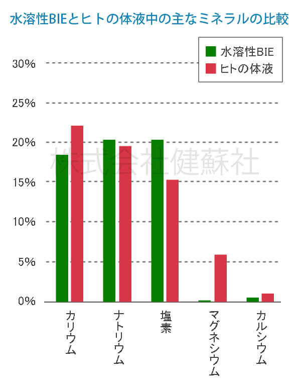 ※人の体液中の主なミネラルは細胞外液がナトリウムと塩素、細胞内液がカリウムであり、水溶性BIEはこの体液のミネラルと共通したバランスを備えています。